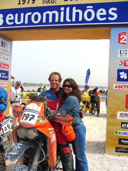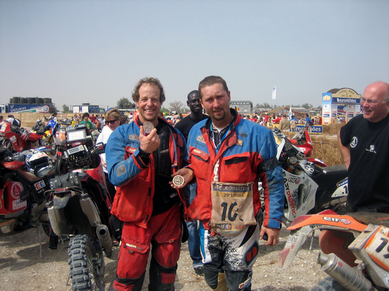 So Steve and I made a plan to head to the surf as soon as the flare lit. Line three was off at 1020 and I got the jump. Steve immediately veered right away from the surf and he started hauling ass on the fresh dry sand. After a marginal start he made up some time on the inside and stuffed a few guys in the first turn. I played it safe and watched as the subframe shook itself to pieces. I quietly talked to it and politely asked it to just stay together, please. Approaching the first couple turns inland we are met with the same dunes we rode in on only now they were lined with thousands of fans. I took the outside line and squared off the turn and just barely saw Steve put a foot down for the next left. With his full tanks the 525 was a handful. I saw a hole on the inside of turn two and grabbed the lead from Steve in our own little race. For the first time since Lisbon I saw Steve put on his race face and let a rip. It didn’t take long for him to pass me back and in a few short moments he was gone toward the finish. The deep sand eventually gave way to really fast fun gravel road for the last 5km. That was seriously the greatest part of the entire race. The screaming people and the first glimpse of the Lac Rose is a memory I will never forget. I slid and drifted to the finish not far behind Steve and when we brought it to a stop we both just shook hands and smiled. It was done. I was completely in my own world.